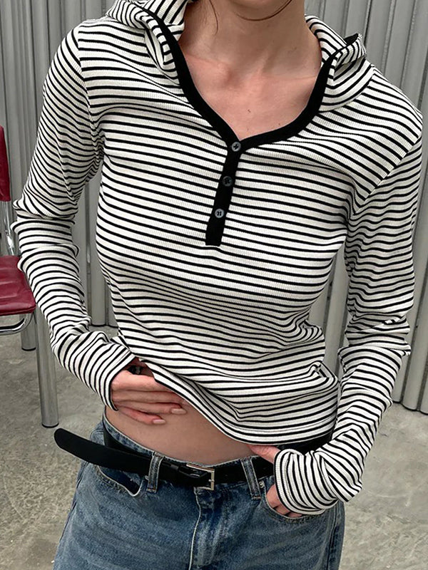 Hooded Striped Loose-Fitting Long-Sleeved Top
