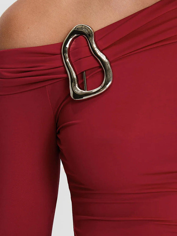 Metal Buckle Slanted Shoulder Long Sleeve