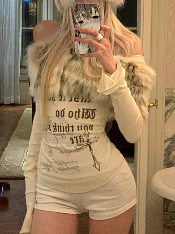 Sexy Hot Girl Fur Collar Letter Print Long Sleeve
